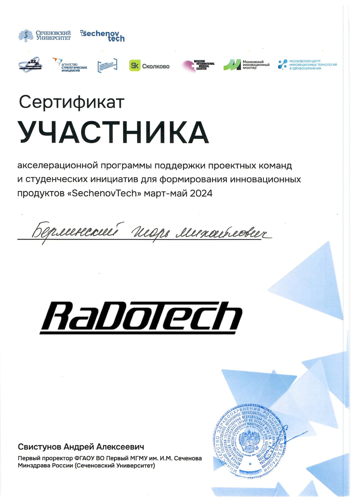 Диплом за победу в номинации "Диагностика и восстановление" получен в 2022г. в рамках акселератора SportTech.